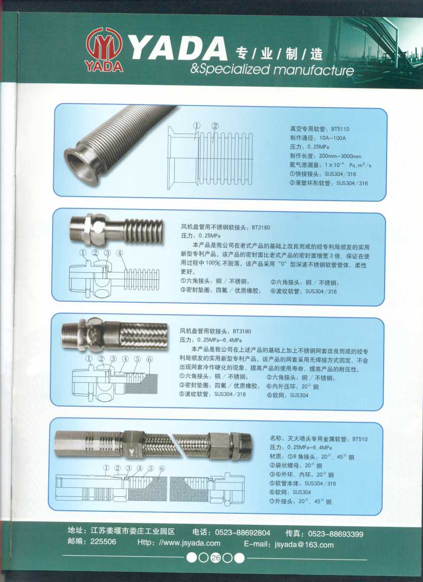 秉天時(shí) 籍地利 仰人和 虔誠(chéng)一個(gè)永恒的理念,創(chuàng)新永續(xù).百諾不如一信,亞達(dá)人堅(jiān)持以信為本,視客戶如同上帝,把對(duì)信譽(yù)的追求,體現(xiàn)在嚴(yán)格的質(zhì)量控制和完善的客戶服務(wù)上,讓客戶百分之百滿意是亞達(dá)人不變的信念。 本廠系ISO9001質(zhì)量認(rèn)證企業(yè)、計(jì)量合格企業(yè)。本廠專(zhuān)業(yè)致力于生產(chǎn)不銹鋼金屬波紋軟管、超高壓、高壓膠管、波紋管補(bǔ)償器(膨脹節(jié))、立式、臥式、冷卻器。本廠產(chǎn)品具有承受壓力高、彎曲半徑小、抗疲勞性能強(qiáng)、使用壽命長(zhǎng)等特點(diǎn)。廣泛應(yīng)用于電力、石化、冶金、水泥建材、工程機(jī)械、礦山及液壓系統(tǒng)。產(chǎn)品暢銷(xiāo)全國(guó)各地。 今日亞達(dá)之成功源自諸多客戶的厚愛(ài),明天的輝煌更離不開(kāi)您對(duì)我的支持與信賴。查看更多>>